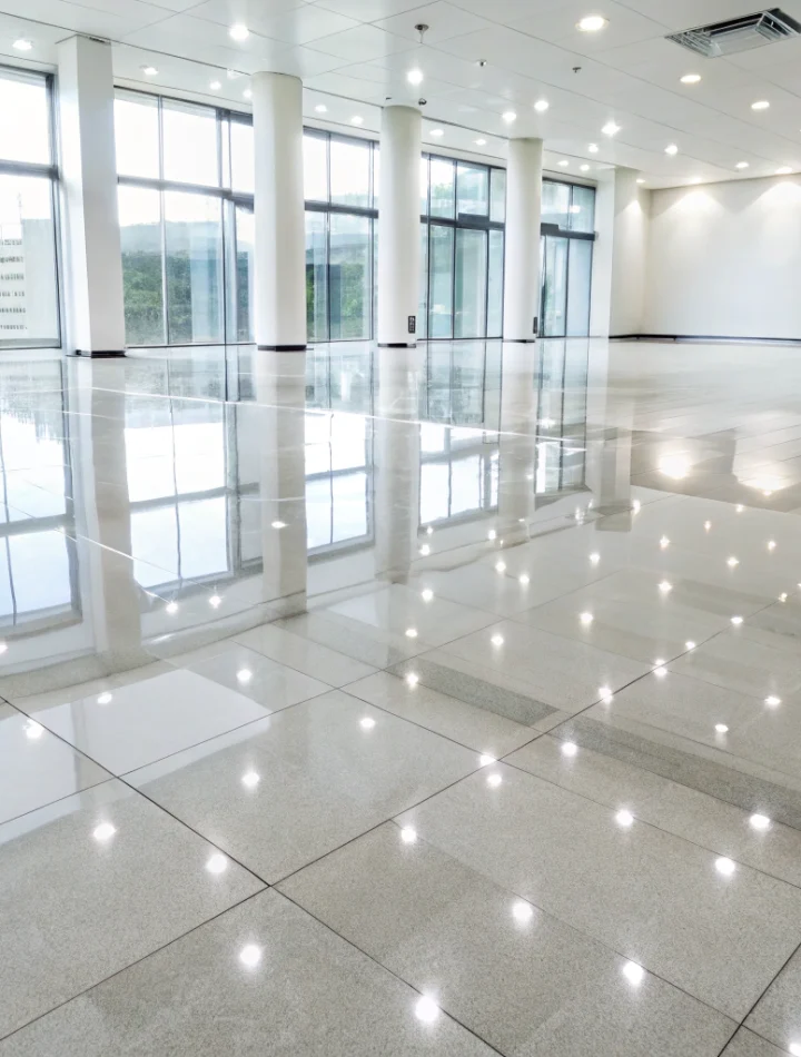 Un sol carrelé propre et luisant dans une pièce bien éclairée, montrant une surface uniforme sans saleté ni objets, avec des reflets naturels de lumière